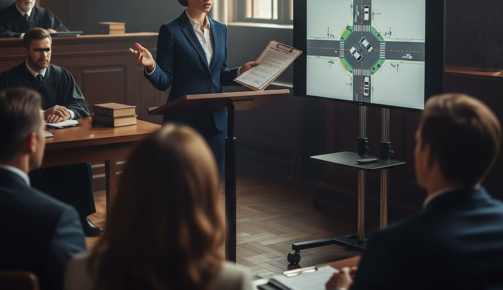 A courtroom scene with an attorney presenting evidence for an accident compensation case.